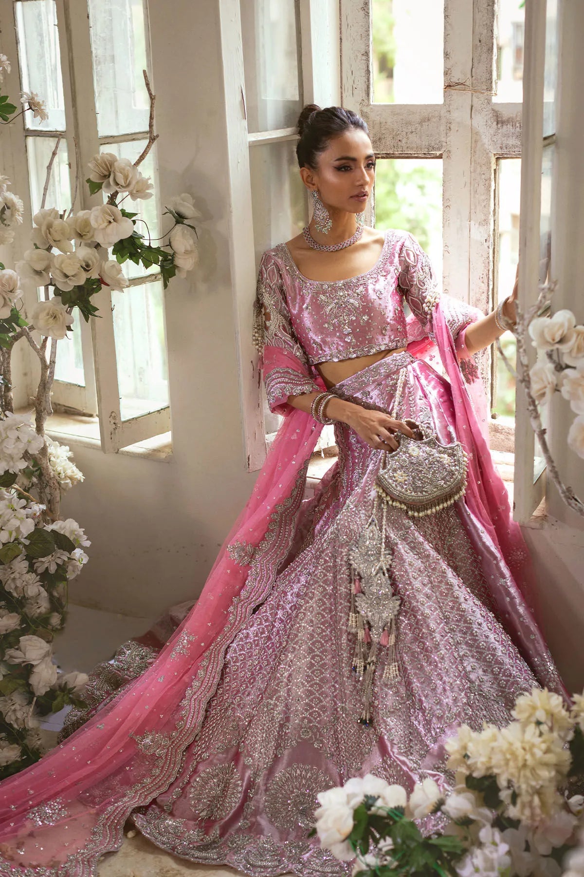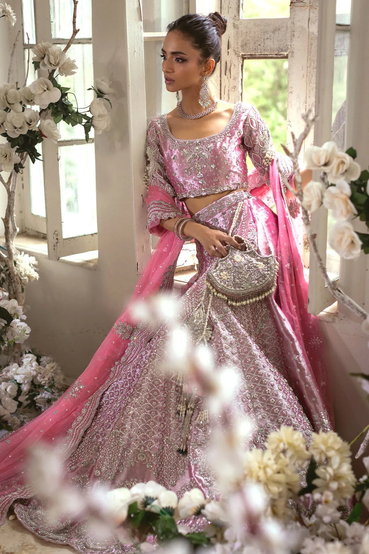 Graceful and radiant, Tamannah by Annus Abrar captures the essence of festive luxury. This breathtaking rose pink lehnga, crafted from a shimmering lamé canvas, exudes sophistication and timeless allure. The ensemble is intricately adorned with silver zardozi embellishments, adding an exquisite touch of opulence to every detail.