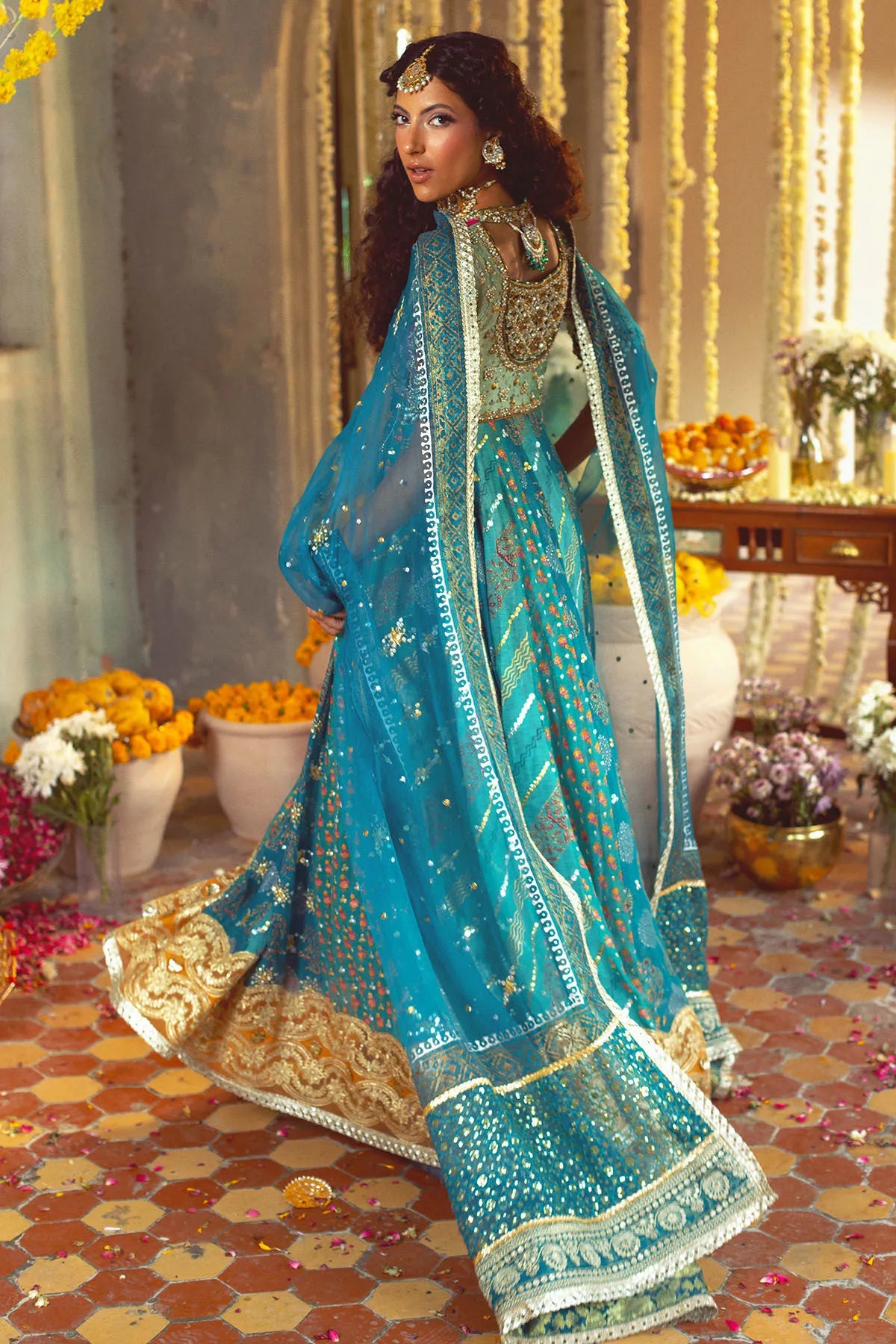 Graceful and timeless, Zeba by Annus Abrar captures the essence of classic luxury with a modern artistic flair. Crafted in exquisite shades of sea green, this floor-length kalidar radiates sophistication through its detailed hand block printing and intricate embellishments. The lamé bodice, accentuated with chatta patti velvet appliqué work, shimmers with antique and silver-gold zardozi detailing, reflecting Annus Abrar’s signature craftsmanship.