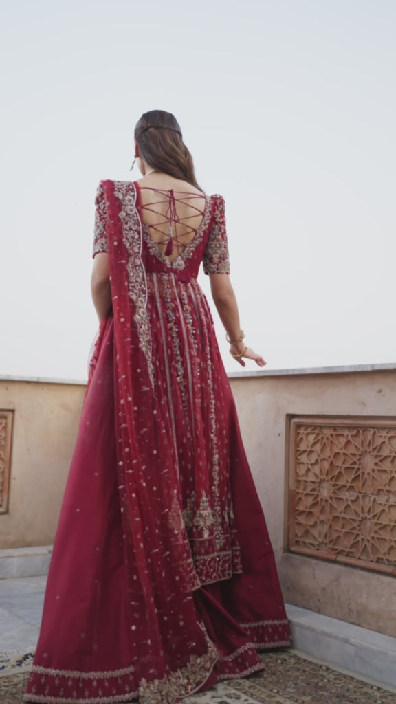 Showcasing pure opulence, Zelia captivates with its scintillating crimson hue and intricate embellishments. Crafted from premium net, the kalidar shirt is adorned with delicately handworked tilla, resham, and sequin motifs that reflect impeccable artistry.